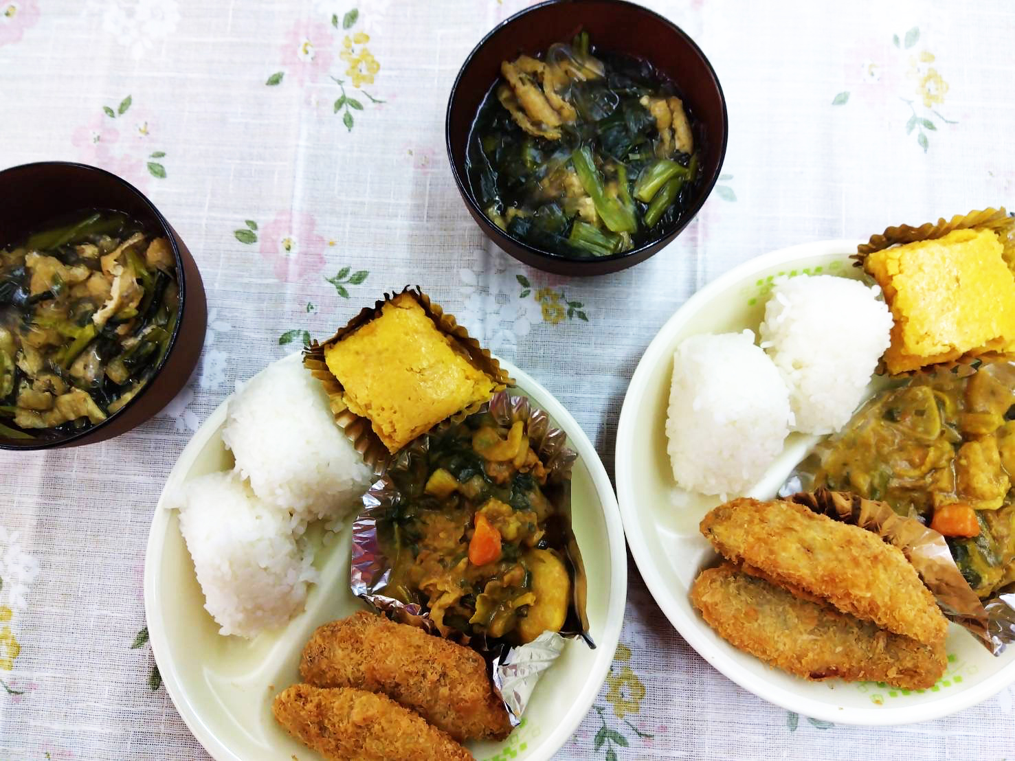 じゃが芋が、たくさん入ったカレーライス、さつま芋とマカロニを和えたサラダ、みかんや柿は子どもも大人にも大好評でした♪たくさんの寄付に感謝します!