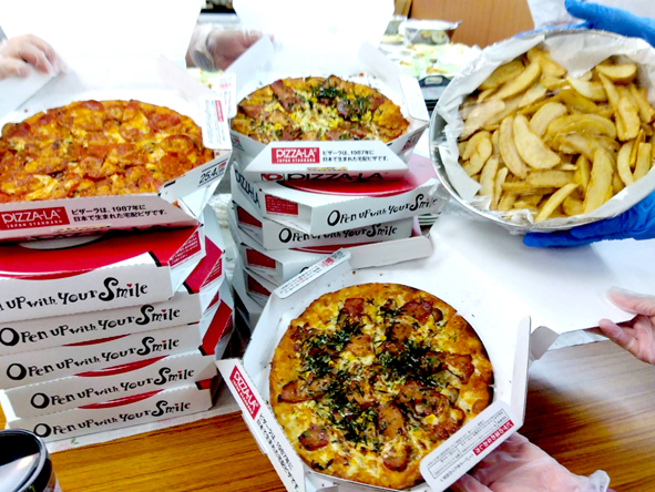 フォーシーズ・ピザーラ八幡店様より、たくさんのビザをいただき、大人も子どもも大喜び!!