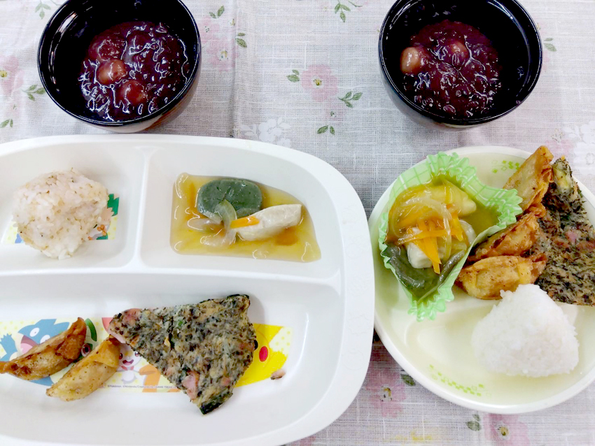 今年、初めての子ども食堂は頂いた食材を使って『あかもくのお焼き』、『揚げ餃子』、『湯葉のあんかけ』を作りました。『白玉ぜんざい』は資さんうどん様から頂いた、あんこで作り、子どもにも大人にも大人気でした♪